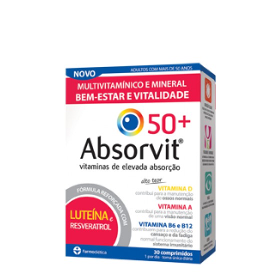 ABSORVIT 50+ é um suplemento alimentar de uma única toma diária com vitaminas, minerais, FOS e GOS. Com teor ajustado de cálcio e selénio, cujas necessidades aumentam com a idade, tem uma composição equilibrada para conferir máxima vitalidade a partir dos 50 anos de idade.