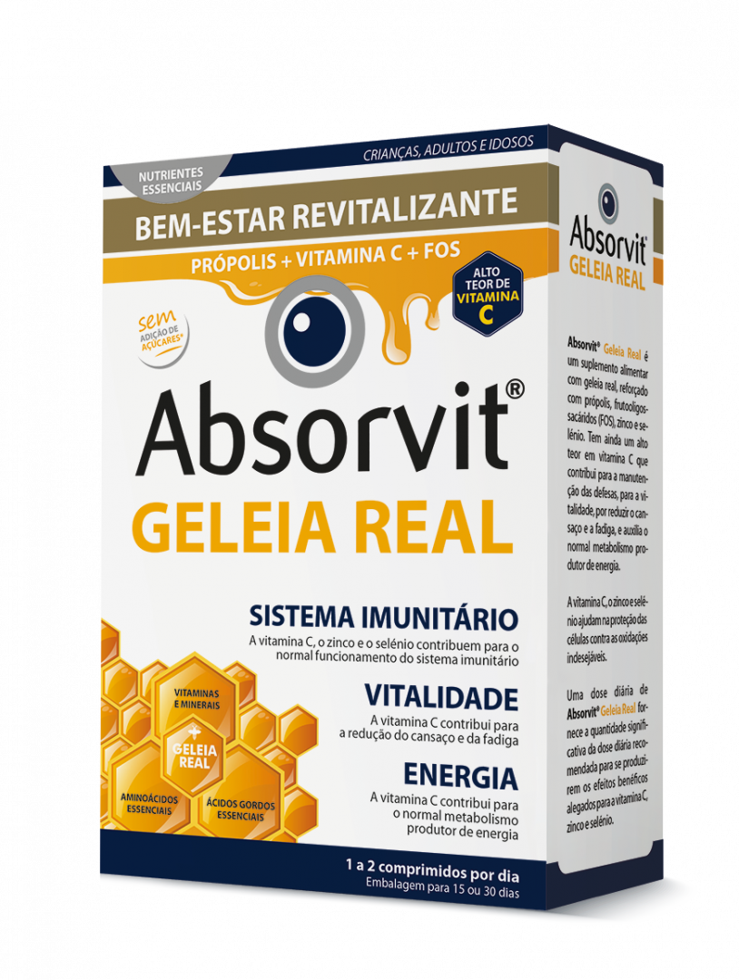 ABSORVIT® GELEIA REAL 1000 mg é um suplemento alimentar com geleia real e alto teor de vitamina C, reforçado com própolis e frutooligossacáridos (FOS), desenvolvido para crianças, adultos e idosos.