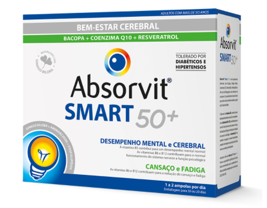 Absorvit Smart 50+ é um suplemento alimentar com Bacopa monnieri, Ginkgo biloba, Coenzima Q10, Trans-Resveratrol e alto teor de Vitaminas do complexo B, especialmente desenvolvido para o bem estar cerebral de adultos, a partir dos 50 anos de idade.