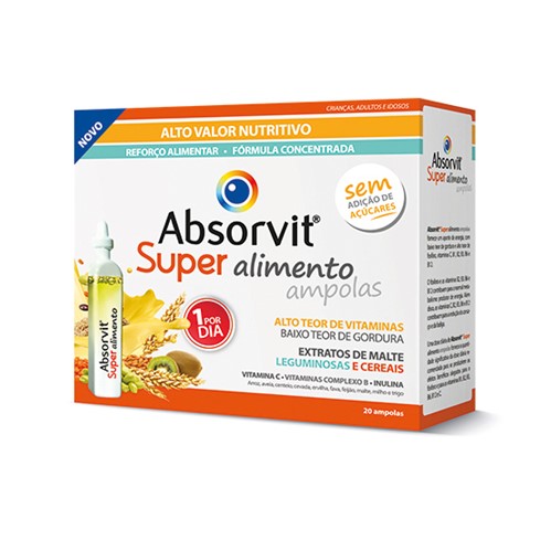 ABSORVIT® SUPER ALIMENTO AMPOLAS fornece um aporte de energia, com alto teor de vitaminas e de proteína, sendo ainda fonte de fósforo.