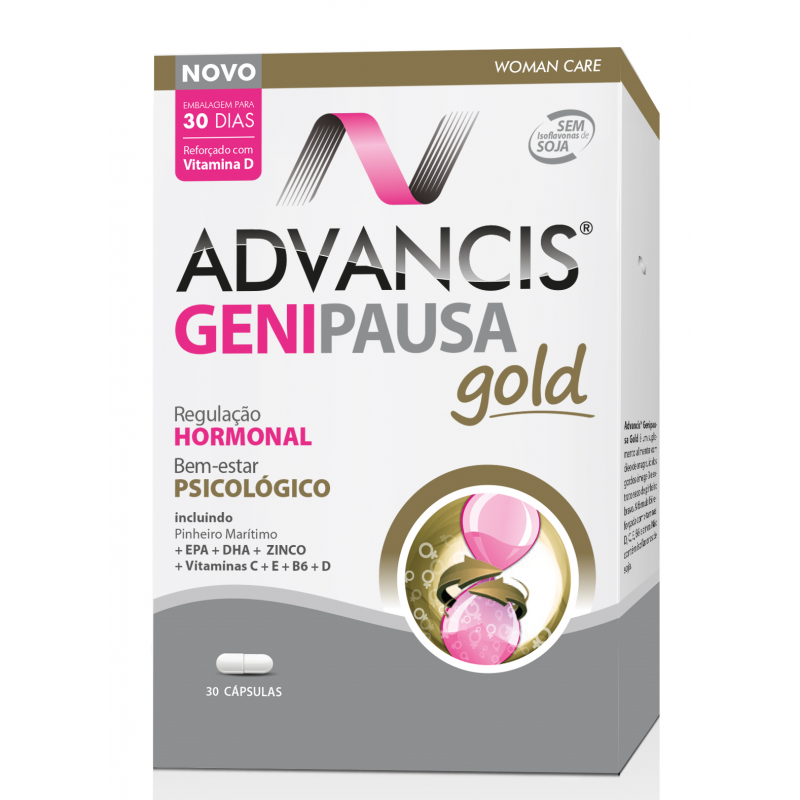 Advancis® Genipausa Gold é um suplemento alimentar especialmente formulado para ajudar no equilíbrio hormonal e bem-estar psicológico da mulher, contribuindo para o alívio dos sintomas da menopausa, sem isoflavonas de soja. Da sua fórmula fazem parte o óleo de onagra, ácidos gordos ómega-3 e extrato seco de pinheiro marítimo. A fórmula foi reforçada com vitaminas D, C, E, B6 e zinco.
