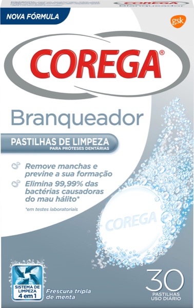 Corega Pastilhas de Limpeza Branqueadoras limpa em profundidade as manchas difíceis (tabaco, café, etc). Elimina 99,9% das bactérias causadoras do mau hálito*. Para próteses dentárias e aparelhos ortodônticos. *em testes laboratoriais