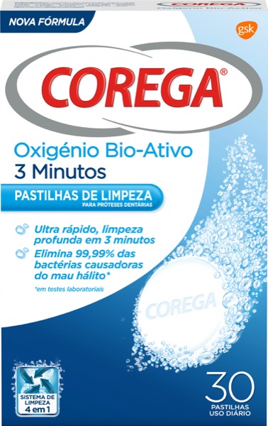 Corega Pastilhas de Limpeza Oxigénio Bio-Ativo proporciona uma limpeza em 3 minutos. Elimina 99,9% das bactérias causadoras do mau hálito*. Para próteses dentárias e aparelhos ortodônticos. *em testes laboratoriais
