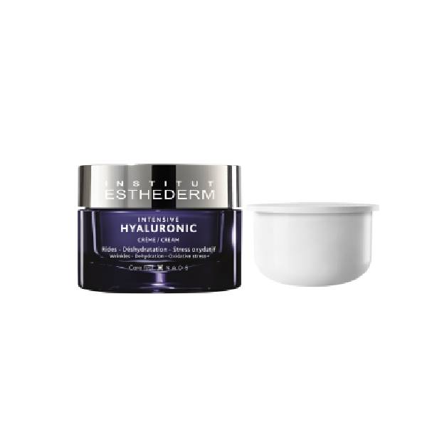 Esthederm Intensive Hyaluronic Creme é um cuidado hidratante e antirrugas intensivo, indicado para pele com rugas, rídulas e desidratação intensa. A fórmula contém um complexo patenteado de três formas diferentes de ácido hialurónico que penetra nas camadas mais profundas da epiderme para redensificar os tecidos, preenchendo-os com água. Protege a pele do stress ambiental, preenche as rugas e as rídulas, reidratando as camadas superficiais da pele, com um efeito matificante, sem efeito oleoso. Deve ser usado como cura de 2 meses, apenas com os tratamentos intensivos da Esthederm, para evitar interações. Testado dermatologicamente.