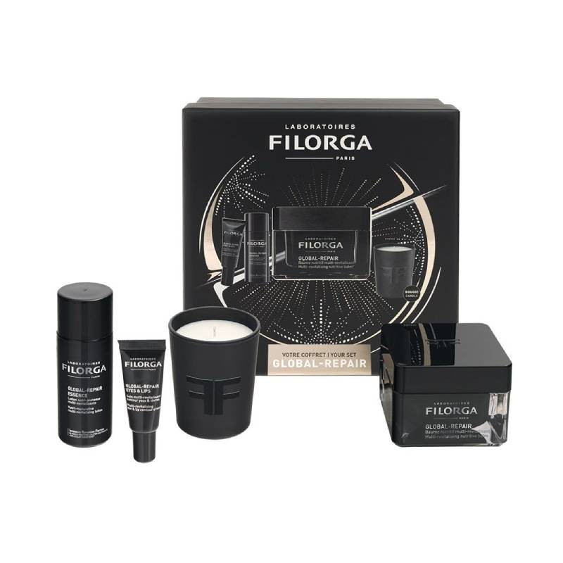 Filorga X-Mas'23 Box Global-Repair é um pack promocional composto por 3 cuidados e uma vela perfumada: Filorga Global-Repair Essence (50ml), Filorga Global-Repair Creme de Olhos e Lábios (4ml), Filorga Global-Repair Creme (50ml) e uma vela perfumada (75g).