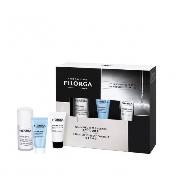 Filorga Coffret Luminosidade Rosto e Olhos é um coffret que contém 3 cuidados para uma rotina de skincare completa: 1 Optim-Eyes Creme (15ml), 1 Hydra-Hyal Sérum (7ml) e 1 Scrub & Detox Esfoliante (7ml).