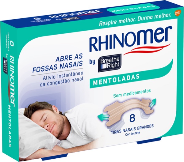 Rhinomer by Breathe Right Mentoladas são tiras nasais revestidas com cápsulas que contêm mentol, eucalipto e cânfora. Ao abrirem as fossas nasais, as tiras nasais Rhinomer by Breathe Right melhoram o fluxo de ar, permitindo um alívio instantâneo da congestão nasal. As tiras nasais Rhinomer by Breathe Right não contêm medicamentos e está clinicamente comprovado que ao abrirem as fossas nasais permitem respirar 31% mais de ar. As tiras Rhinomer by Breathe Right são duas bandas plásticas flexíveis patenteadas. O adesivo especial permite que a tira se ajuste comodamente sobre as abas do nariz e a sua ação de flexão permite que as bandas elevem as fossas nasais abrindo e mantendo os canais nasais abertos. As tiras Rhinomer by Breathe Right podem ser usadas de dia ou à noite para o alívio de congestão nasal, devido a alergias, constipações, ressonar, ou desvio do septo, mas não devem ser usadas mais de 12h por dia.