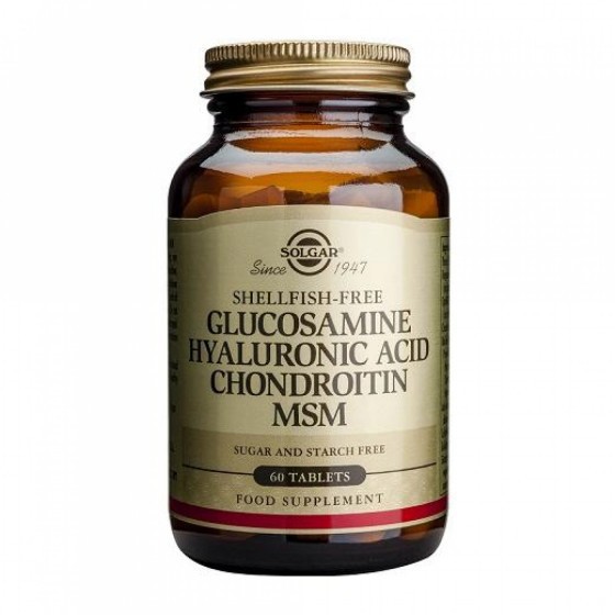 Solgar glucosamina, ácido hialurónico, condriotina e MSM é um suplemento alimentar que fornece glucosamina, ácido hialurónico, condriotina e MSM. A glucosamina presente neste suplemento alimentar é isenta de derivados de mariscos.