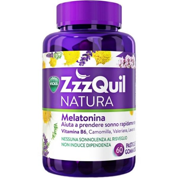 ZzzQuil® NATURA gomas pode ser o seu novo aliado. Contém 1 mg de melatonina, uma hormona naturalmente presente no organismo que regula o sono, e uma associação de 3 extratos de plantas (valeriana, camomila e lavanda). Não necessita tomar com água pois as gomas, com um delicioso aroma a frutos do bosque, são mastigáveis. Sem corantes nem aromas artificiais.
