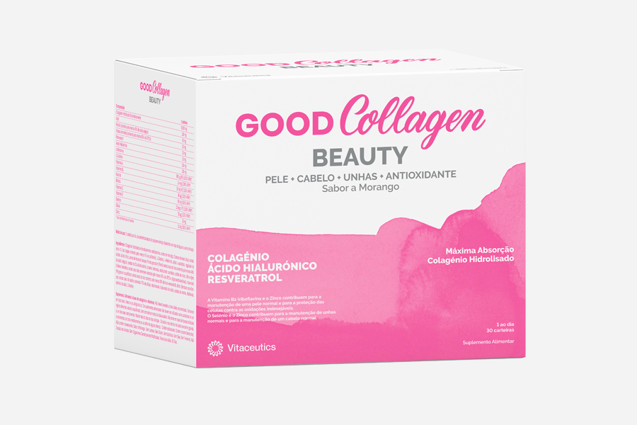 Colagénio Hidrolisado Enzimaticamente 5000 mg ; Açaí 150 mg; Romã (contendo pelo menos 40% de ácido elágico) 50 mg; Videira Vermelha (contendo pelo menos 95% de OPC's) 20 mg; Resveratrol 10 mg; Ácido Hialurónico 10 mg; L-Metionina 100 mg; L-Cisteína 100 mg; Vitamina A 800 µg RE (100% VRN*); Vitamina B2 1,4 mg (100% VRN*); Niacina 16 mg NE (100% VRN*); Biotina 50 µg (100% VRN*); Vitamina C 80 mg (100% VRN*); Vitamina E 12 mg α-TE (100% VRN*);Selénio 55 µg (100% VRN*) Silício 15 mg; Zinco 10 mg (100% VRN*)