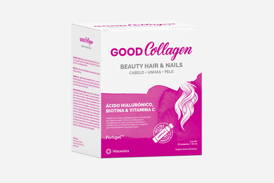 Colagénio Hidrolisado Enzimaticamente 5000 mg, Ácido Hialurónico 15 mg, Biotina 50 μg (100% VRN*), Vitamina C 80 mg (100% VRN*), Zinco 10 mg (100% VRN*).